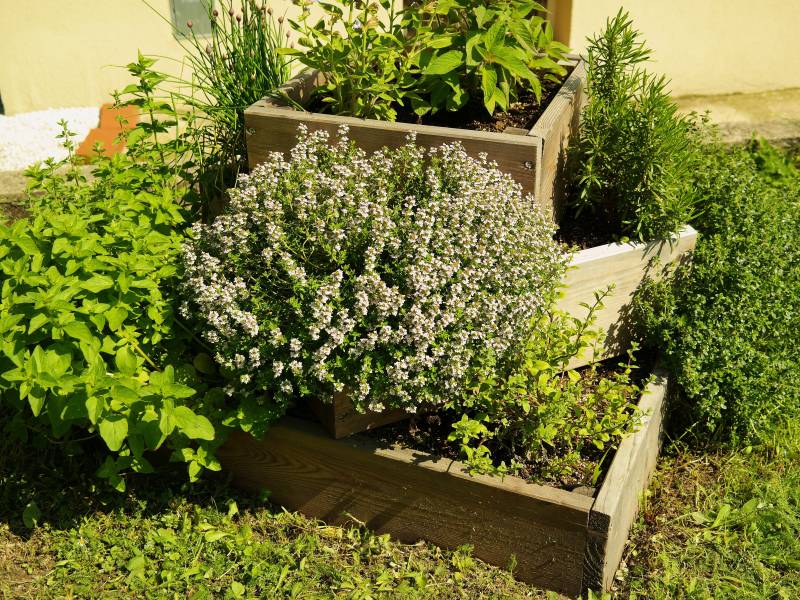 Auf nur 3 Stufen eines 80 cm² kleines Pyramiden-Hochbeets bringst du immerhin 9 verschiedene Kräuter unter. Setze sonnenhungrige Pflanzen wie Thymian, Zitronenthymian, Oregano, Rosmarin und Salbei an die Südseite oder in den obersten Stock. Für die schattige Seite sind Kräuter wie Schnittlauch, Schnittknoblauch, Petersilie und Kresse geeignet.