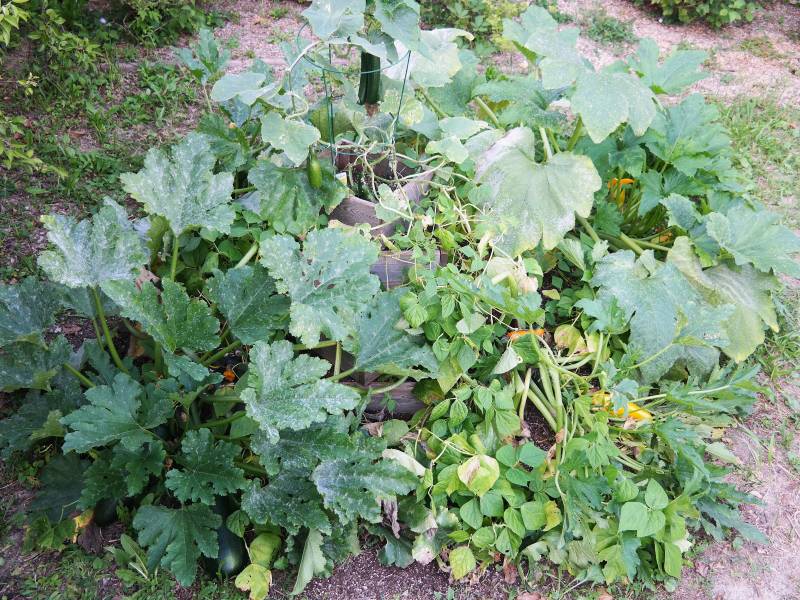 Funktioniert wunderbar, wenn rund ums Hochbeet noch etwas Platz ist, denn die Zucchini wuchern über den Hochbeetrand hinaus. Setze oder säe in die 4 unteren Ecken je eine Zucchinipflanze. Für Abwechslung sorgen verschiedene Sorten, z.B. gelbe, grüne oder runde Zucchini. Säe in die 2. und 3. Etage Buschbohnen, sie wachsen auch im Windschatten der großen Zucchiniblätter sehr gut. Im obersten Stock ist entweder Platz für weitere Buschbohnen oder für einen Stock Bohnenkraut.