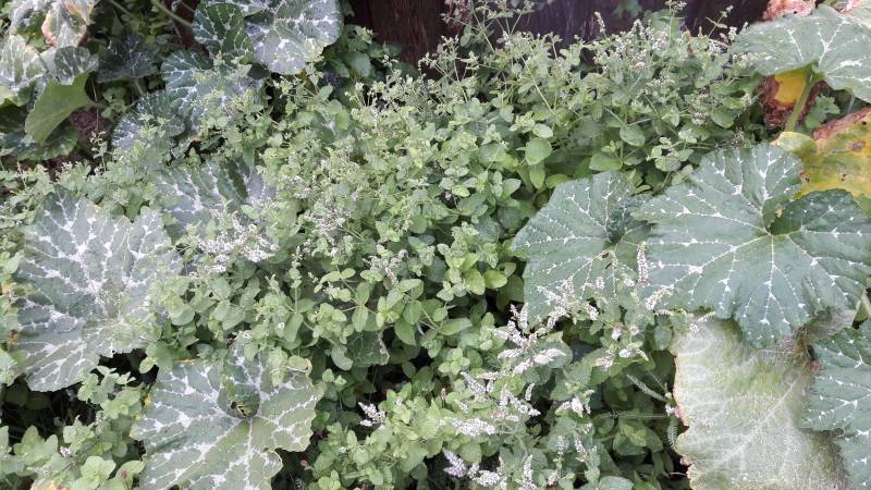 Minze wirst du nicht mehr los. Sie überwuchert sogar die stark wachsende Kürbispflanze.