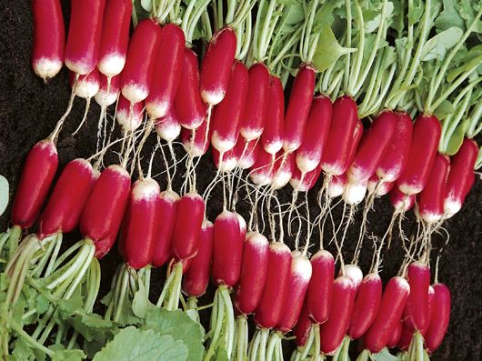 Sehr dekoratives Radieschen mit zylindrischer Form. Die rote Wurzel hat eine weiße Spitze. Alte und erprobte Sorte.