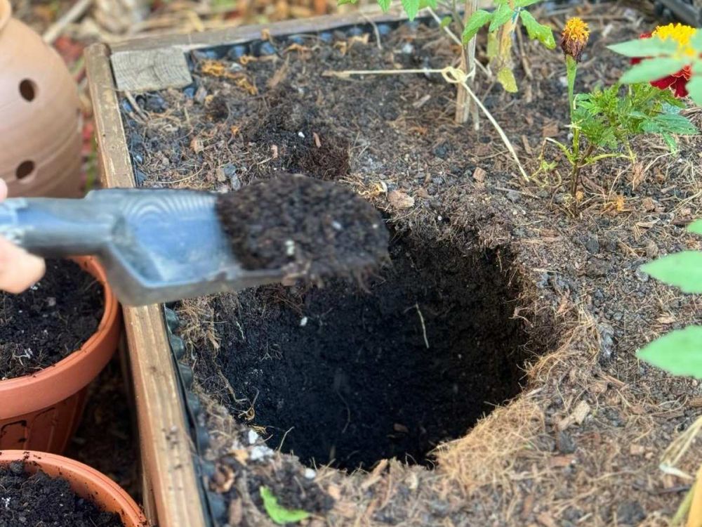 - Grabe den Komposter in dein Hoch- oder Gartenbeet mit der Öffnung nach oben so tief ein, dass nur der obere Rand aus der Erde herausschaut.