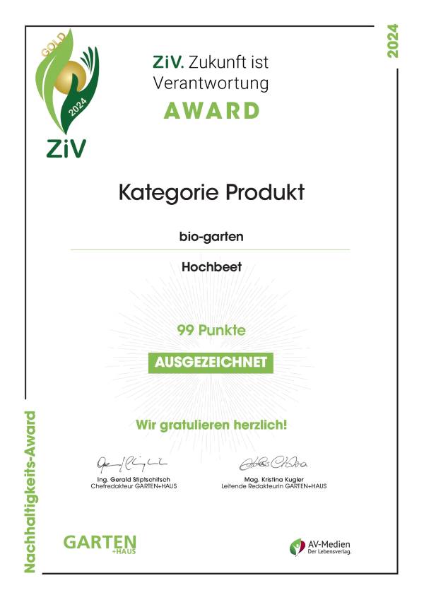 Zum Jahresende 2024 erhielten wir eine tolle Nachricht. Wir wurden mit dem ZiV-Award, dem Nachhaltigkeits-Award der renommierten Gartenzeitschrift Garten und Haus ausgezeichnet – und das gleich doppelt. Sowohl in der Kategorie Unternehmen als auch Hochbeete wurden wir jeweils mit Gold prämiert und erreichten in der Bewertung sagenhafte 100 (Unternehmen) bzw. 99 (Hochbeete) von je 100 möglichen Punkten.