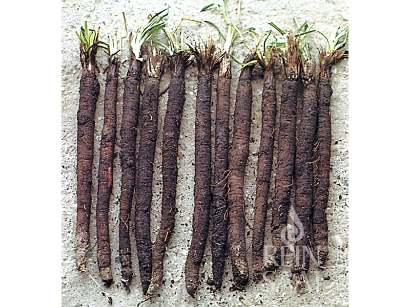 Selektion dicker, festfleischiger und zarter, langer Wurzeln. Abgestumpft und keine Verzweigungen. Schöne schwarzbraune Farbe der feinen Oberhaut.