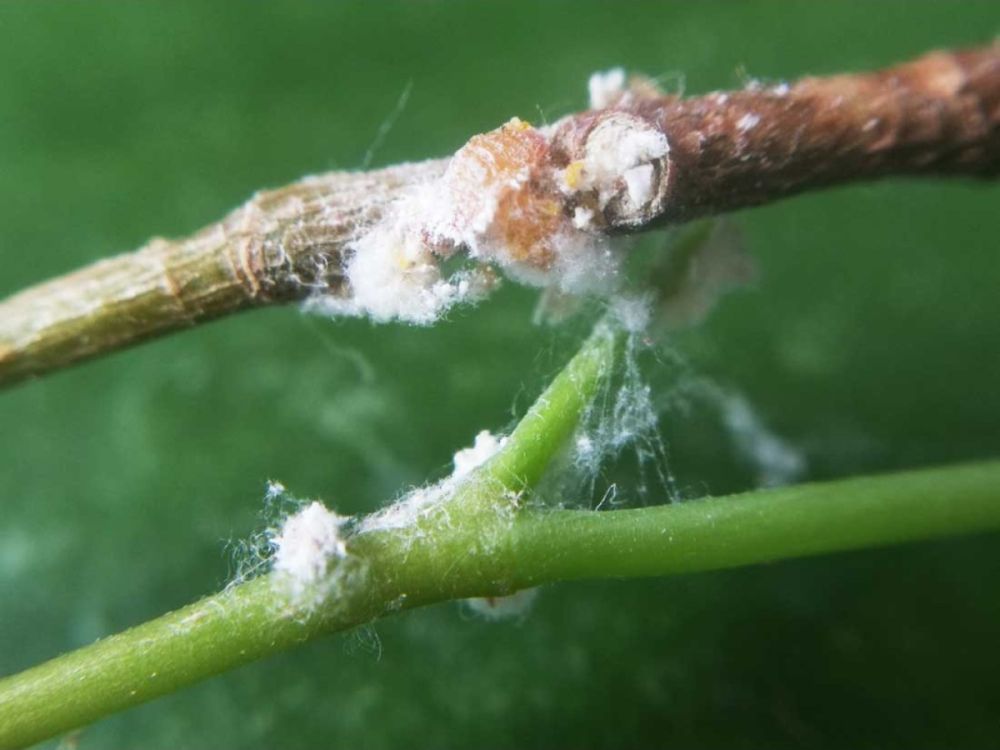 Den Wolllausbefall erkennst du am watteartigen oder schaumartigen Belag, vorwiegend an den Blattunterseiten, in den Blattachseln oder an Stängeln/Zweigen.