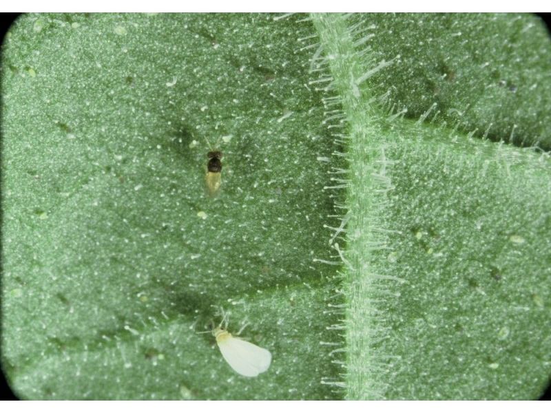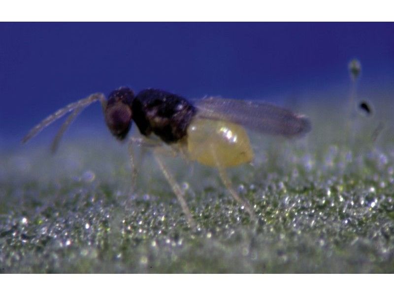 Die Erzwespe ist nur ca. 0,6 mm lang, hat schwarze Kopf und Brust und gelben Hinterleib. Sie legt mithilfe eines Stachels ihre Eier in die Larven von Weißen Fliegen ab. Die parasitierten Larven verfärben sich nach ca. zwei Wochen schwarz, voran man die Wirkung gut erkennen kann. Die junge Erzwespe, die sich in der Larve entwickelt, verzehrt diese langsam von innen her.